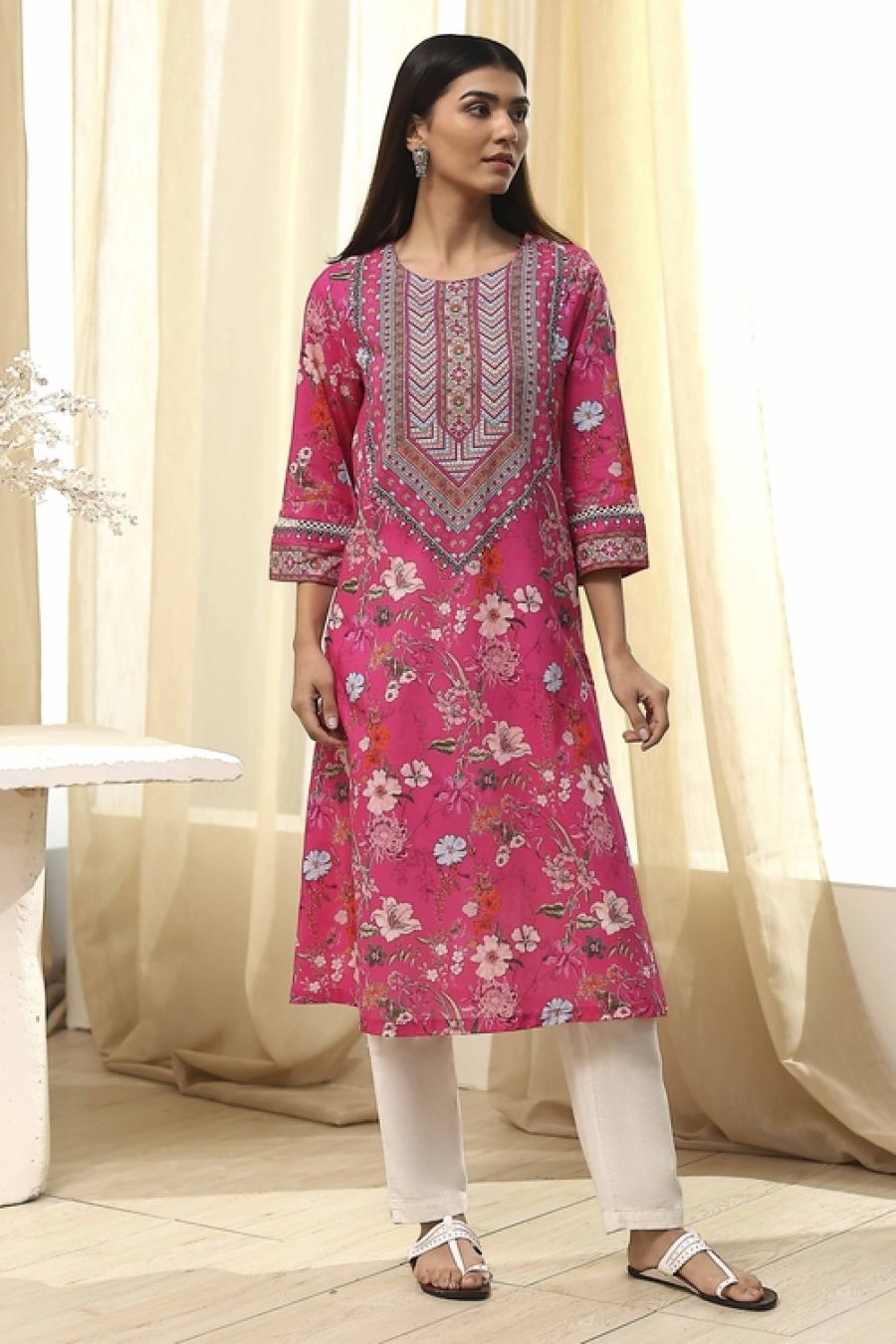 Be the First One to followPink Pure Cotton Floral Straight Kurta for Women – Elegant & Comfortable