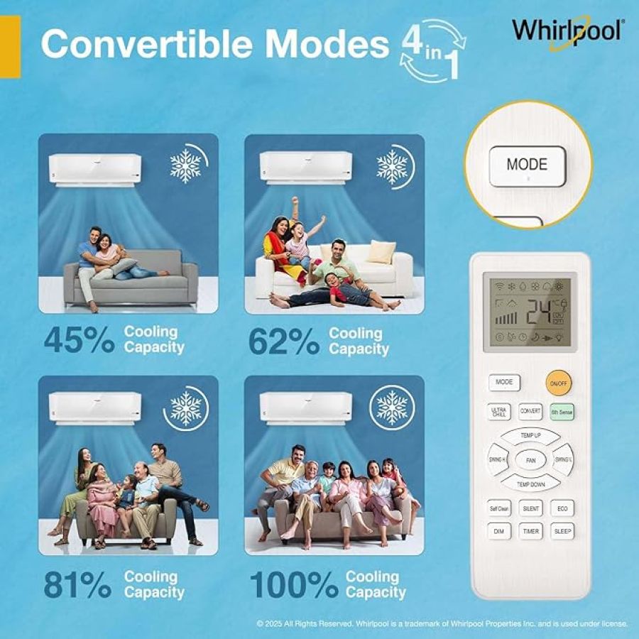 The Whirlpool 2.0 Ton 3 Star Supremecool Inverter Split AC is designed for powerful and efficient cooling in medium to large rooms. Equipped with an Intellisense Inverter compressor, it automatically adjusts the cooling power based on the room heat load for consistent comfort and energy saving. With Convertible 4-in-1 cooling modes, you can choose the ideal capacity for different weather conditions, helping you save energy when full cooling isn’t required. The 100 % copper condenser coil improves heat transfer and reduces maintenance, while the HD air filter helps trap dust and airborne particles for cleaner indoor air. This smart AC also offers features like 6th Sense technology, stabilizer-free operation, and a sleek design that blends with modern interiors.